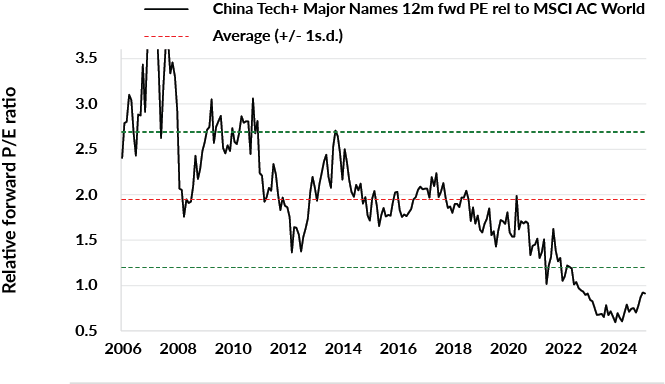 Chinese tech companies/major names vs. MSCI All Country World Index – Relative monthly forward P/E ratio