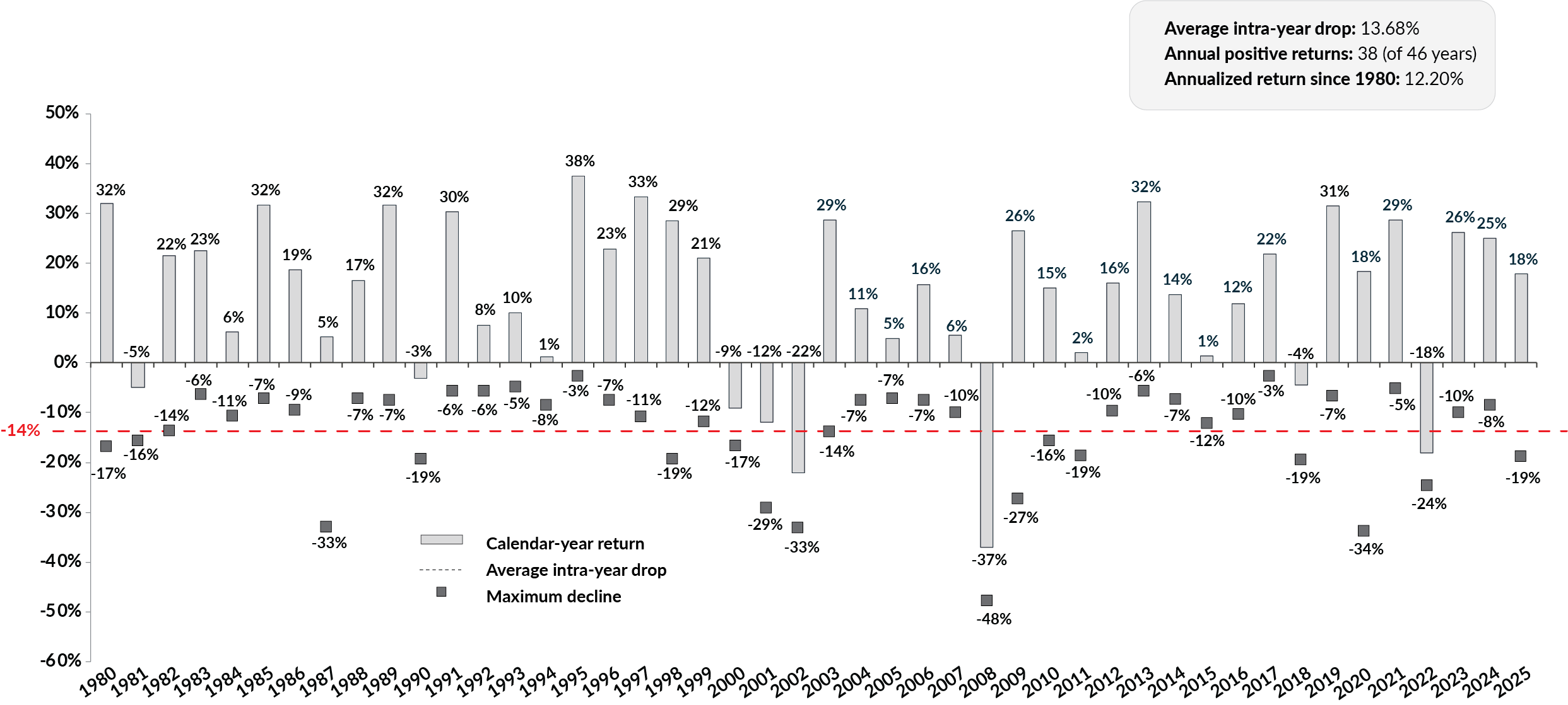 Source: Bloomberg LP. As at December 31, 2025. Total return net dividends calculated daily and in US$. Maximum decline is the largest intra-year market drop from a peak-to-trough during the calendar year. Calendar-year returns shown from 1980 to December 31, 2025. Annualized returns since 1980 include reinvestment of dividends. The index is not investible.