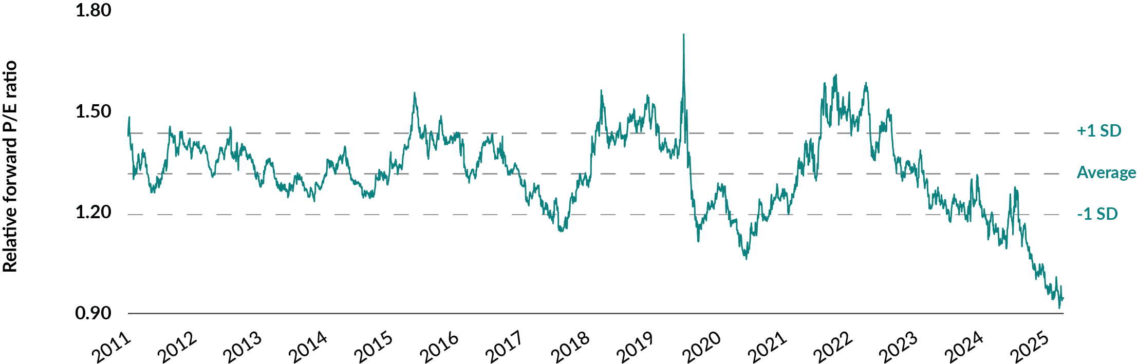 Crossing the Atlantic, European stocks appeared to offer better relative value than U.S. large caps based on the previous 20 years. In this case, they were about one standard deviation away from the average. That might have been a chance to buy some great companies at a discount.