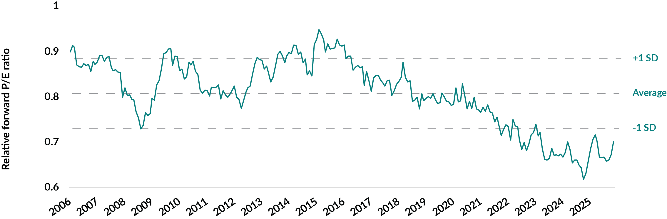 Source: Andrew Garthwaite & Marc el Koussa, “Equity 2026 Outlook part 1: Equity Direction and Regional Preferences”, UBS Research Global Equity Strategy, November 26, 2025. Forward earnings over the next twelve months were used in price-to-earnings ratio calculations. The index is not investible.