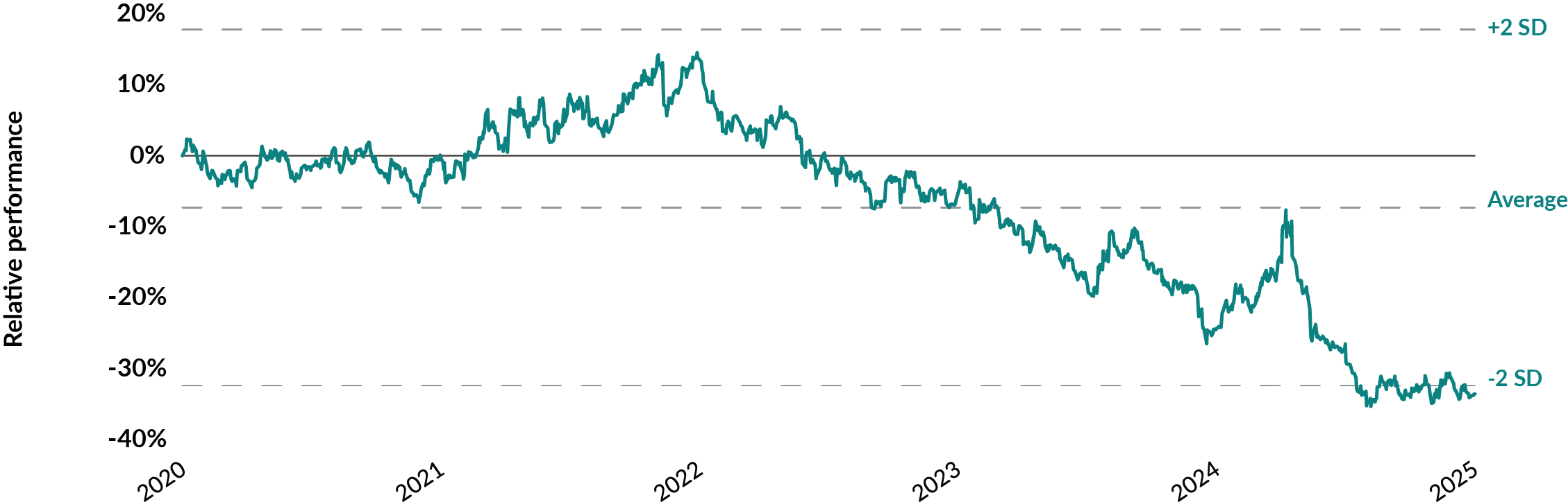 Crossing the Atlantic, European stocks appeared to offer better relative value than U.S. large caps based on the previous 20 years. In this case, they were about one standard deviation away from the average. That might have been a chance to buy some great companies at a discount.