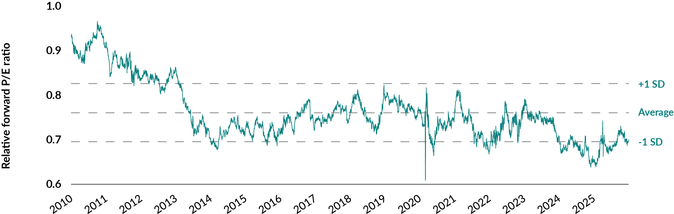 MSCI Global Emerging Market Index vs. MSCI All Country World Index – Relative monthly forward P/E ratio