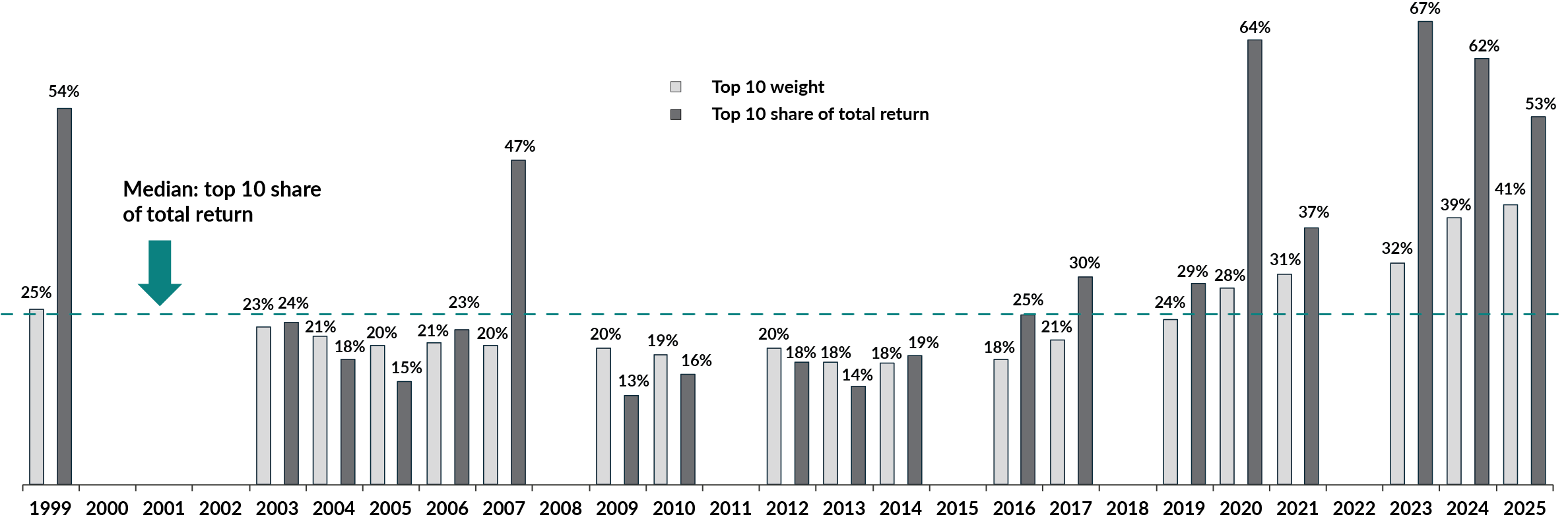 Source: FactSet Research Systems Inc. Share of annual total return was calculated in US$. Excludes years when the S&P 500 Index total return was 3% or less. Top 10 positions weight was calculated at the end of each calendar year. The SPDR S&P 500 ETF Trust was used as a proxy for the S&P 500 Index. The S&P 500 Index is a broad-based market-capitalization-weighted index of 500 of the largest and most widely held U.S. stocks. The index is not investible. As at December 31, 2025, the gross expense ratio for the ETF is 0.0945%. An ETF that tracks an index is subject to tracking error where its holdings and return differ from the underlying index. Factors such as fees and transaction costs may affect ETF’s ability to fully replicate the index’s constituent holdings.