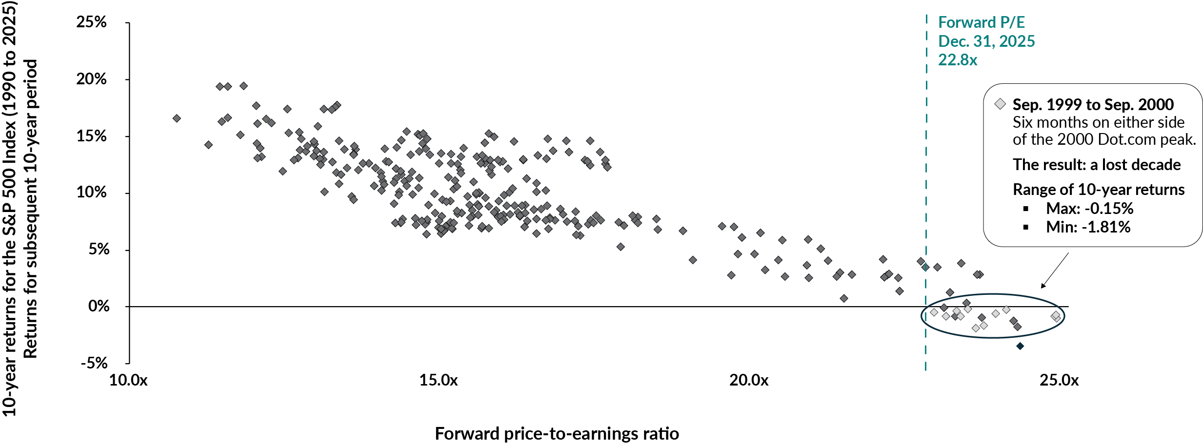S&P 500 Index – Monthly forward price-to-earnings (P/E) ratio and subsequent 10-year returns