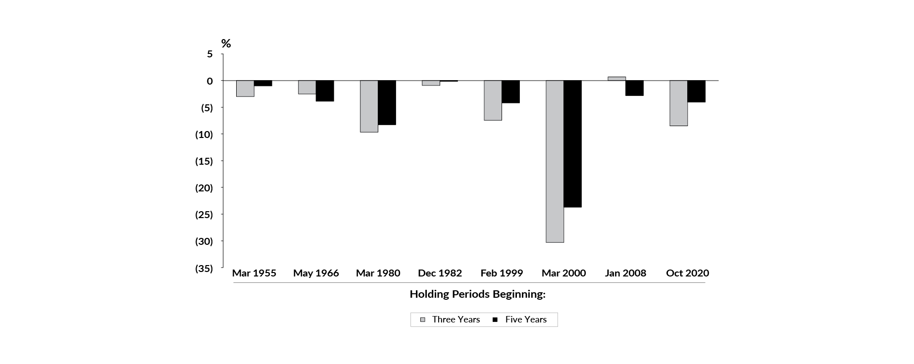 Top quintile of momentum stocks Total annualized 3-year & 5-year returns following momentum stock peaks (US$)