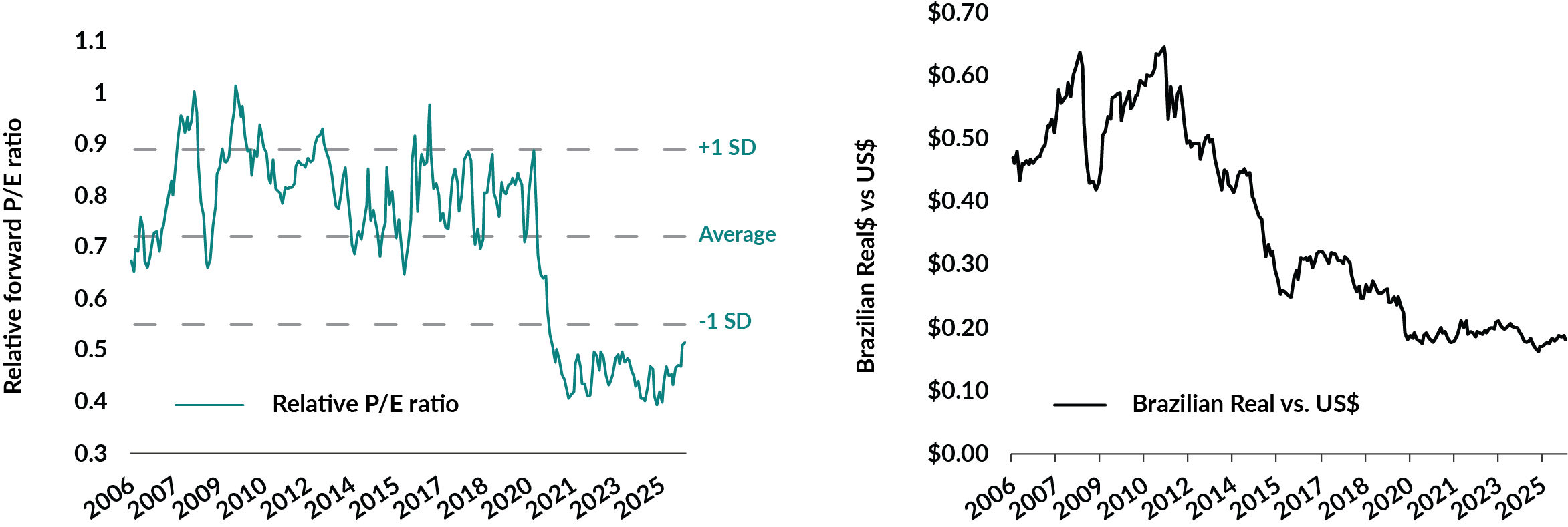 MSCI Brazil Index vs. MSCI All Country World Index – Relative monthly forward P/E ratio & Brazilian Real vs. US$