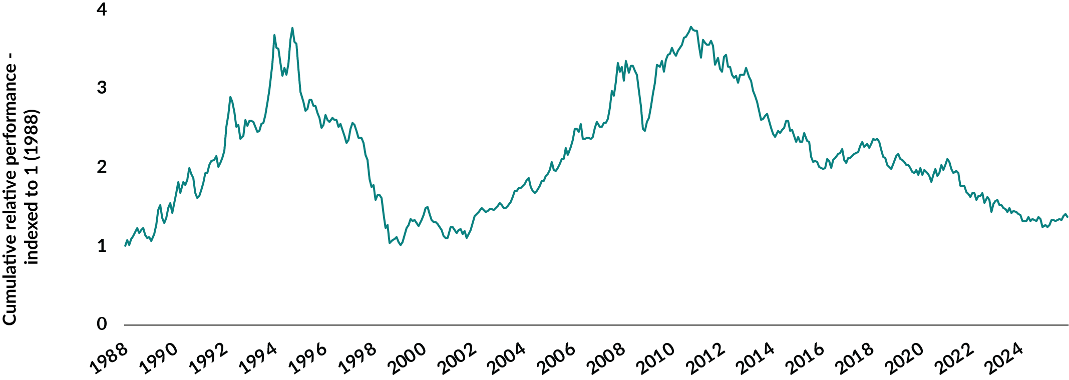 MSCI Global Emerging Markets Index vs. MSCI World Index – relative performance (US$)