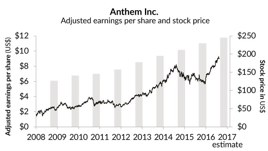 Let’s look at a Cymbria holding, Anthem Inc., to expand on this point. Below is a graph demonstrating the progression in earnings per share (a common measure of profitability) for Anthem over time: