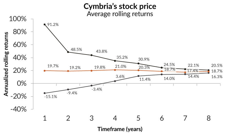 Annualized rolling return is calculated based on Cymbria’s stock price return. Date range: November 03, 2008 to June 30, 2017. In C$.
