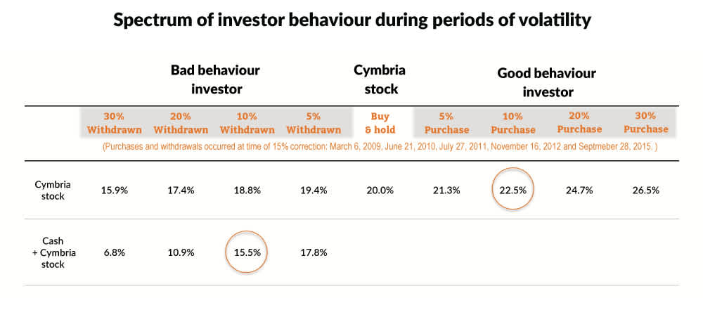 Specifically, this table shows that simply buying and holding Cymbria since inception has resulted in a compound annual return of 20.0%. However, had an investor pulled out 10% of their investment every time the portfolio fell by more than 15% (which has occurred five times in the history of the Portfolio), then their return would have fallen to 15.5%. Alternatively, had they added 10% to their position on those five occasions, their return would have been 22.5%.