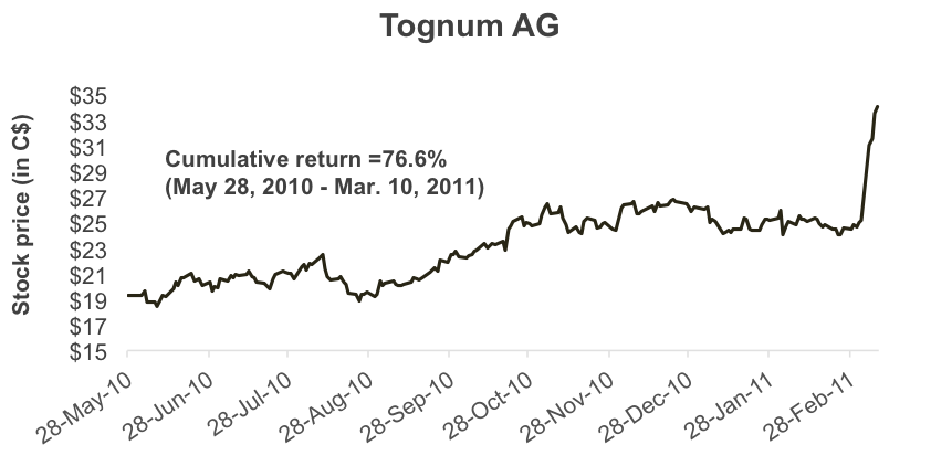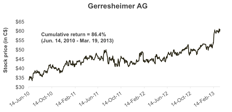 Source: Bloomberg, LP. Cumulative total return of the stock for holding period.