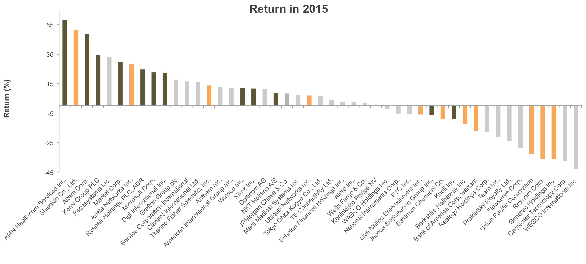 The following graph illustrates the annual percentage return for each one of the holdings in Cymbria in 2015. The orange bars represent new ideas purchased during the year and the brown bars show names we sold during the year.