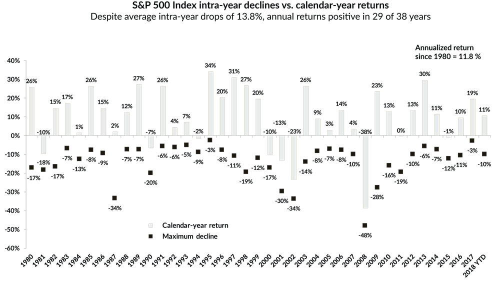 Source: Bloomberg LP. As at September 30, 2018. Returns based on price index only, excludes dividends and in US$. Maximum decline is the largest intra-year market drop from a peak-to-trough during the calendar year. Calendar-year returns shown from 1980 to 2017. Annualized return includes reinvestment of dividends. The S&P 500 Index is a broad-based market-capitalization-weighted index of 500 of the largest and most widely held U.S. stocks.