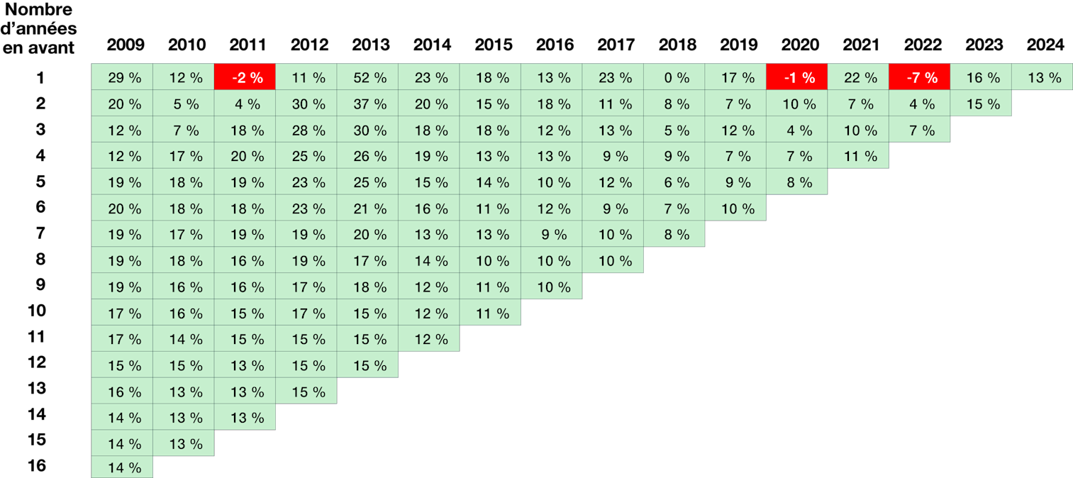 Le parcours a été marqué jusqu'à présent par une volatilité à court terme, mais les investisseurs de Cymbria qui ont investi dans le Portefeuille mondial EdgePoint au fil du temps ont rarement subi de pertes à long terme. Le tableau suivant présente les rendements annualisés en fonction de la date de votre premier investissement (axe horizontal) et de la durée de votre investissement (axe vertical). Par exemple, un investissement réalisé le 1er janvier 2009 aurait généré un rendement de 29 % sur un an (première colonne vers le bas), un rendement annualisé de 20 % sur deux ans et un rendement annualisé de 14 % sur 16 ans. Les rendements sont codés par couleur : vert pour les gains et rouge pour les pertes. Depuis notre création en 2008, il n'y a eu que trois périodes de rendements annuels négatifs, chacune ne durant qu'un an. C'est le résultat de notre méthode d’investissement.