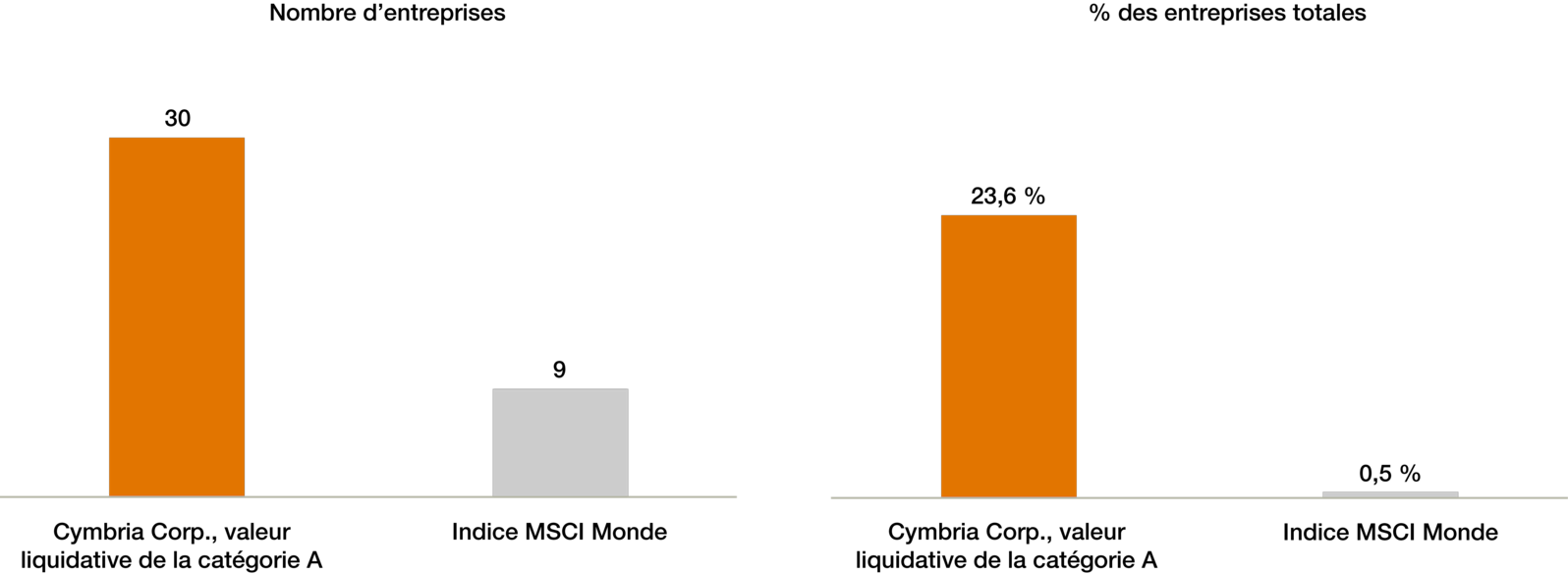 Cymbria a toujours détenu entre 50 et 60 entreprises à tout moment, y compris des entreprises privées telles que Gestion de patrimoine EdgePoint. Au cours des cinq dernières années, l'indice MSCI Monde a inclus plus de 1 900 entreprises, mais seules neuf d'entre elles ont contribué à plus de 1 % au rendement global. En revanche, Cymbria détenait 127 investissements publics qui ont chacun ajouté plus de 1 % à notre portefeuille. Comme le montre le graphique de droite, 24 % de nos idées ont généré un rendement supérieur à ce seuil pour le portefeuille, contre seulement 0,5 % pour l'indice MSCI Monde.