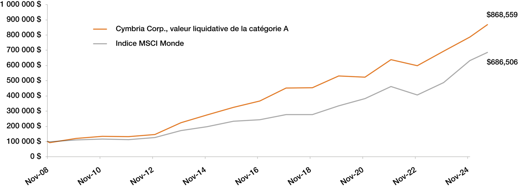 Cymbria Corp., valeur liquidative de la catégorie A par rapport à l’indice MSCI Monde – Croissance de 100 000 $CA