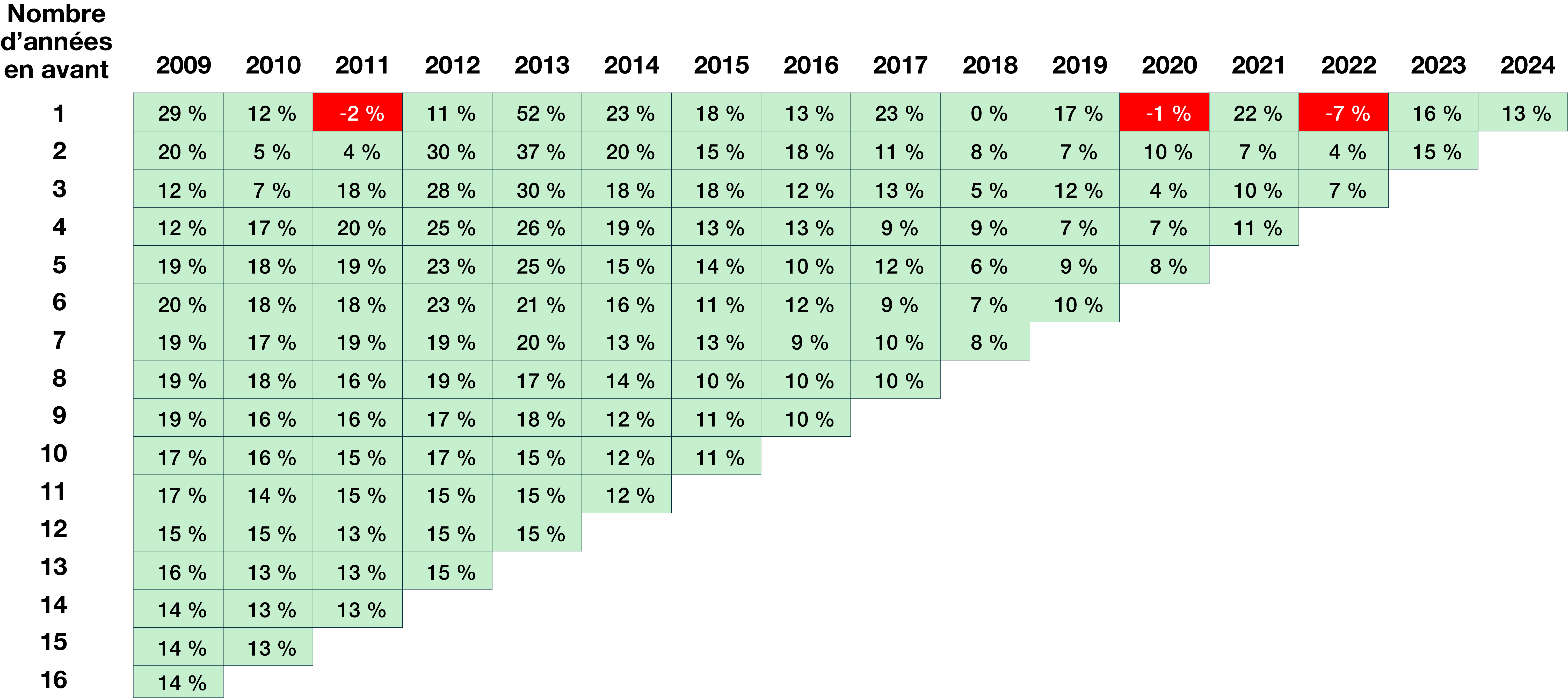 Le parcours a été marqué jusqu'à présent par une volatilité à court terme, mais les investisseurs de Cymbria qui ont investi dans le Portefeuille mondial EdgePoint au fil du temps ont rarement subi de pertes à long terme. Le tableau suivant présente les rendements annualisés en fonction de la date de votre premier investissement (axe horizontal) et de la durée de votre investissement (axe vertical). Par exemple, un investissement réalisé le 1er janvier 2009 aurait généré un rendement de 29 % sur un an (première colonne vers le bas), un rendement annualisé de 20 % sur deux ans et un rendement annualisé de 14 % sur 16 ans. Les rendements sont codés par couleur : vert pour les gains et rouge pour les pertes. Depuis notre création en 2008, il n'y a eu que trois périodes de rendements annuels négatifs, chacune ne durant qu'un an. C'est le résultat de notre méthode d’investissement.