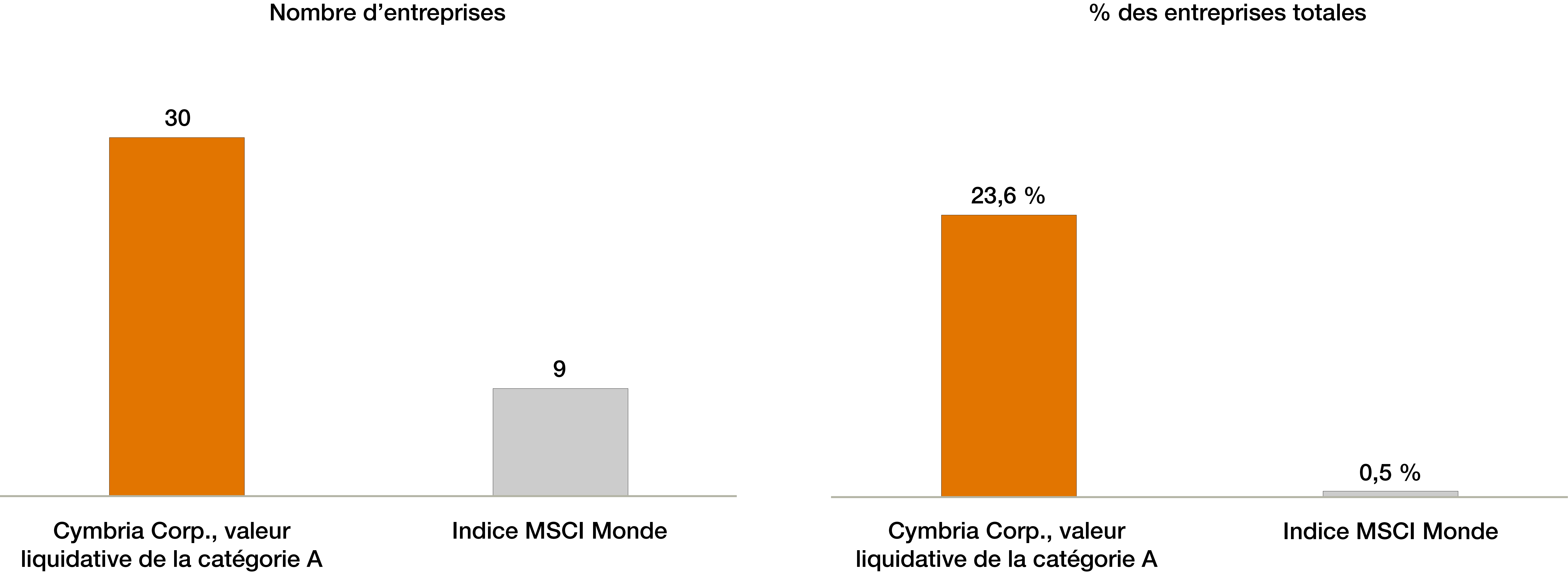 Cymbria a toujours détenu entre 50 et 60 entreprises à tout moment, y compris des entreprises privées telles que Gestion de patrimoine EdgePoint. Au cours des cinq dernières années, l'indice MSCI Monde a inclus plus de 1 900 entreprises, mais seules neuf d'entre elles ont contribué à plus de 1 % au rendement global. En revanche, Cymbria détenait 127 investissements publics qui ont chacun ajouté plus de 1 % à notre portefeuille. Comme le montre le graphique de droite, 24 % de nos idées ont généré un rendement supérieur à ce seuil pour le portefeuille, contre seulement 0,5 % pour l'indice MSCI Monde.