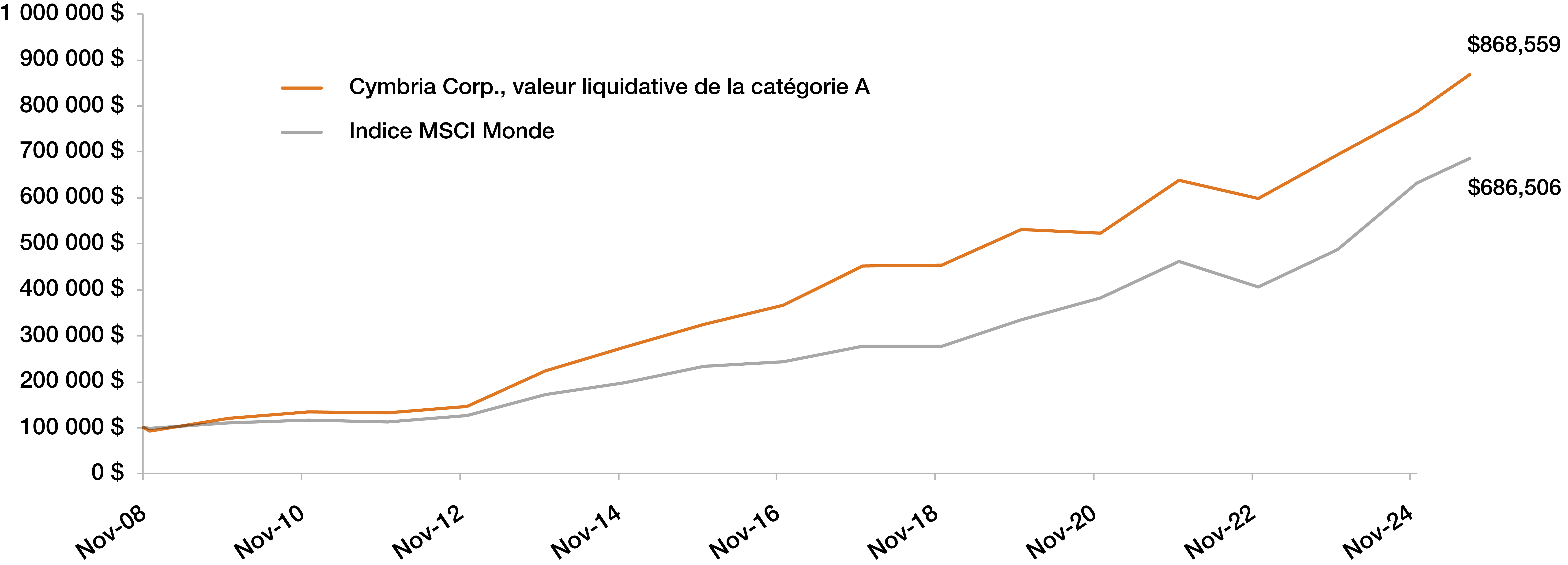 Cymbria Corp., valeur liquidative de la catégorie A par rapport à l’indice MSCI Monde – Croissance de 100 000 $CA