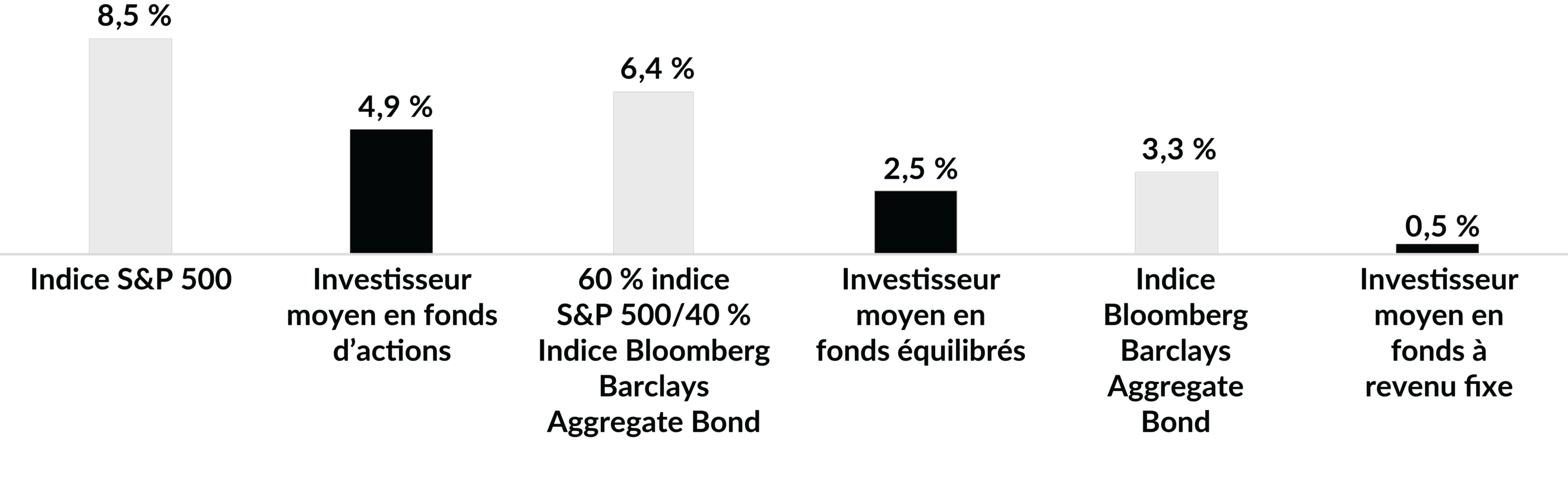 Source : « Quantitative Analysis of investor Behaviour », DALBAR, Inc., 2018. Rendements au 31 décembre 2017 en $ US. L’investisseur moyen en fonds à revenu fixe investit dans un univers de fonds communs de placement à revenu fixe, composés d’obligations de qualité supérieure, à rendement élevé, d’État, municipales, multisectorielles et mondiales. Il n’investit pas dans les fonds du marché monétaire. L’investisseur moyen en fonds équilibrés investit dans un univers de fonds composés d’une combinaison de titres de capitaux propres et de titres de créance. L’investisseur moyen en fonds d’actions investit dans un univers de fonds communs de placement d’actions nationales et mondiales. Cet univers englobe des fonds de croissance, sectoriels, de stratégies alternatives, de valeur, mixtes, des marchés émergents, d’actions mondiales, d’actions internationales et d’actions régionales. L’indice S&P 500 est un indice diversifié pondéré en fonction de la capitalisation boursière qui se compose de 500 titres américains parmi les plus importants et les plus détenus. L’indice Bloomberg Barclays Aggregate Bond Index est un indice de référence phare qui mesure le marché des obligations de qualité supérieure libellées en dollars américains, imposables et à taux fixe.