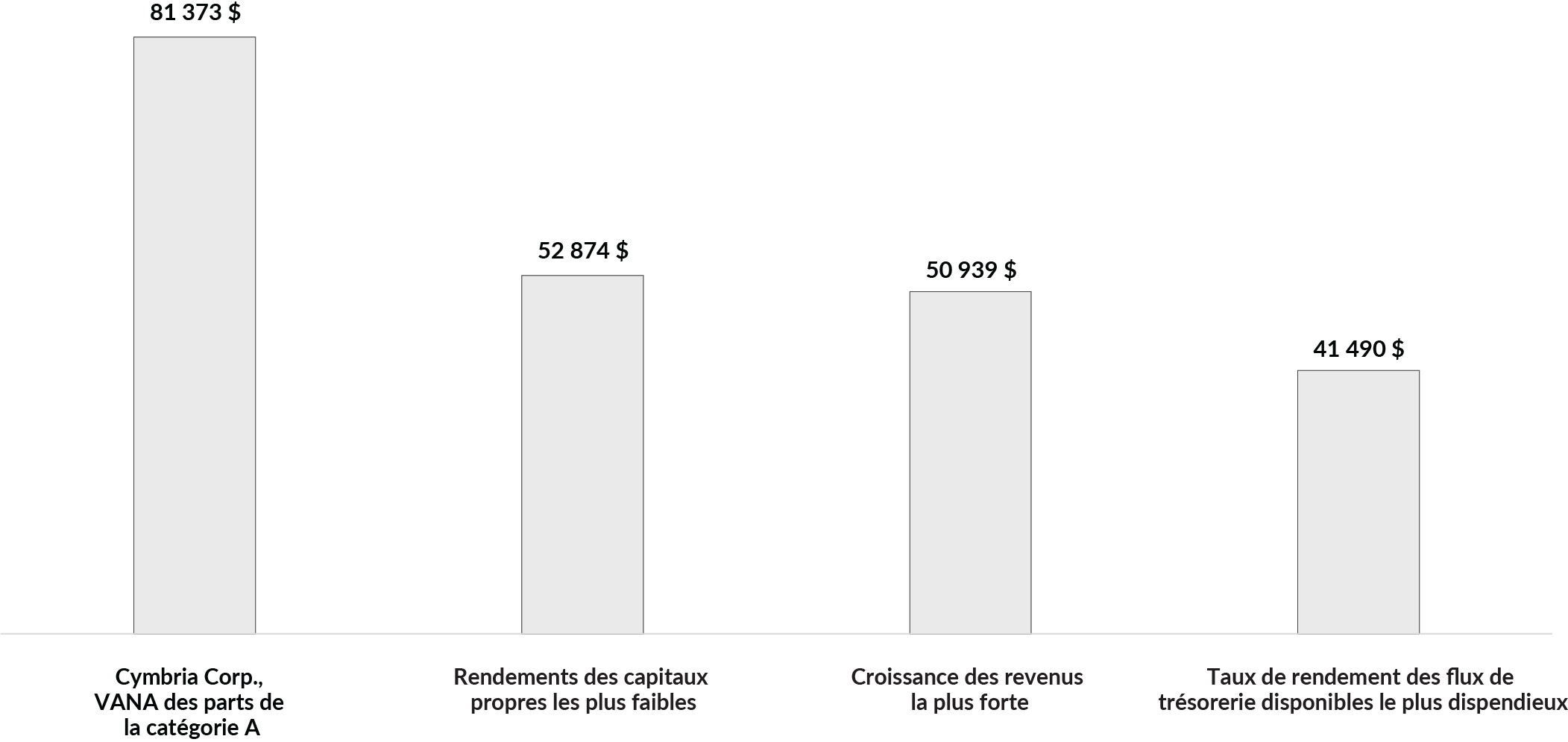 Et voici ce qu'un investissement de 20 000 $ dans chacune des stratégies ci-dessus, et dans Cymbria Corp., VANA des parts de la catégorie A, aurait donné au cours des 10 dernières années.