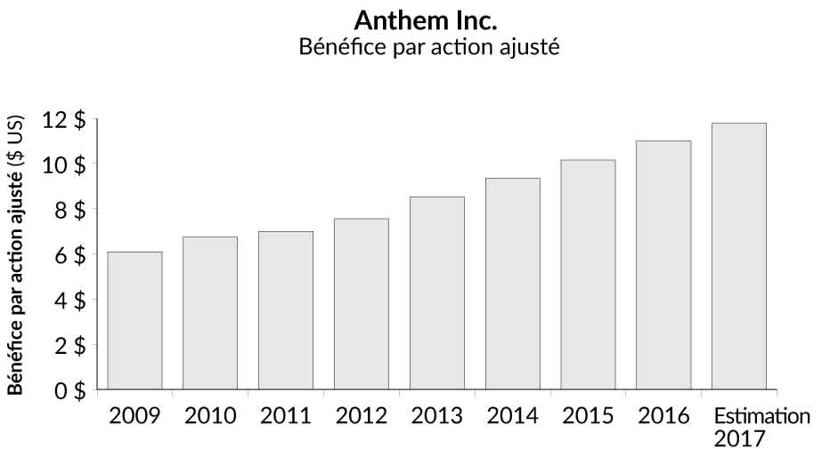 Jetons un coup d’œil à un titre de Cymbria, Anthem Inc., pour éclairer ce point. Voici un graphique qui illustre la progression du bénéfice par action (mesure courante de la rentabilité) d’Anthem au fil du temps :