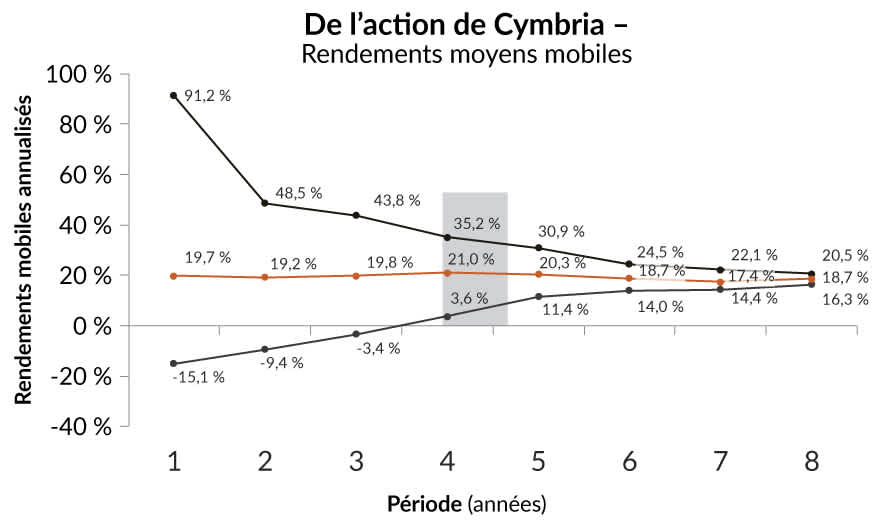 Le rendement de l’encaisse de l’action de Cymbria est calculé en tant que moyenne pondérée de l’encaisse retirée rapportant 0 % et de l’action Cymbria rapportant le taux de rendement pondéré en fonction des flux de trésorerie externes.