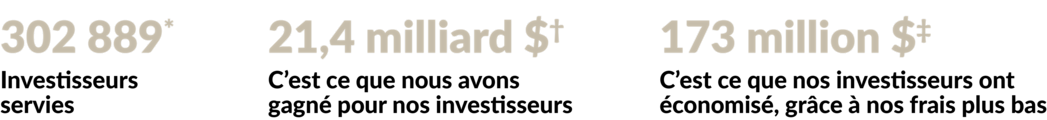‡Au 31 décembre 2024. Source : Strategic Insight, Morningstar Direct. Les économies de frais sont calculées en utilisant une moyenne des actifs sous gestion mensuels pour les séries A et A sans TVH pour les années 2009 à 2017 et les séries F et F sans TVH à partir de 2018. En raison de l'évolution des actifs vers les fonds à honoraires, nous croyons qu'il est plus pertinent d'utiliser les RFG des séries F et F sans TVH à partir de 2018. La série F est offerte aux investisseurs qui ont conclu des ententes de services tarifés ou de services-conseils et exclut les commissions de suivi. Les économies de frais pour le Portefeuille de revenu mensuel EdgePoint sont calculées à partir de 2022. Les RFG moyens par catégorie sont fournis par Strategic Insight à la fin de l'année civile pour les années 2009 à 2017. Morningstar Direct est utilisé à partir de l'année 2018. RFG moyens par catégorie des séries de fonds à honoraires, à l'exclusion des séries institutionnelles, dans les catégories suivantes : Actions mondiales, Actions canadiennes, Actions canadiennes ciblées, Actions mondiales équilibrées, Équilibré neutre mondial, Équilibrée mondial à revenu fixe, Actions canadiennes équilibrées, Équilibré canadien neutre, Équilibré canadien à revenu fixe, Revenu fixe canadien, Mondial à revenu fixe et Revenu fixe multisectoriel. Seuls les fonds actifs de chaque année civile ont été utilisés dans le calcul. Pour les fonds qui n'ont pas déclaré le RFG de 2024 avant le 28 février 2025, le RFG de 2023 a été utilisé. Les économies de frais sont une approximation.