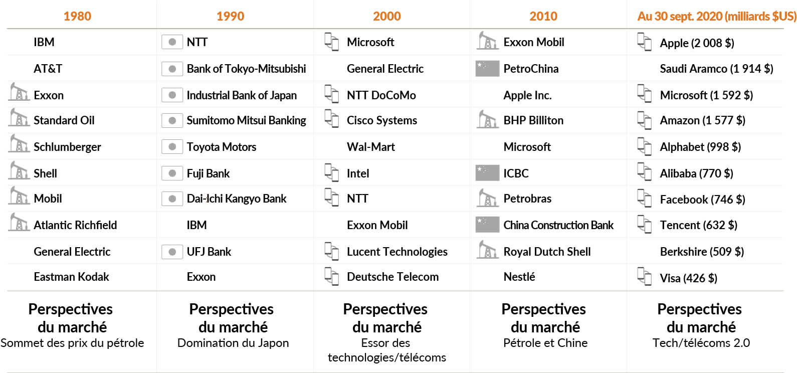 Examinons comment les choses changent au fil du temps par rapport à ce qui peut sembler évident à un moment donné. Ce graphique montre les dix premières actions par capitalisation boursière au niveau mondial au début de chaque décennie.