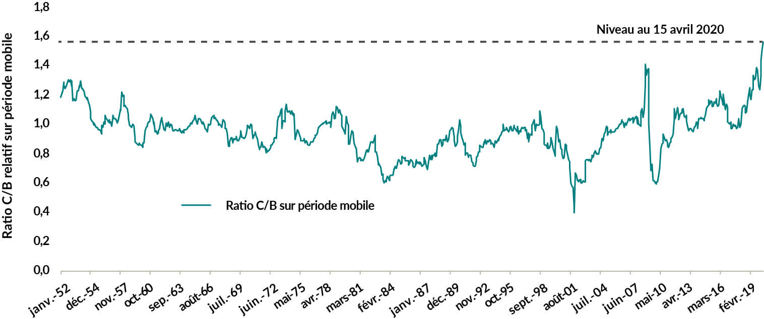 Source : Empirical Research Partners Analysis, National Bureau of Economic Research. Le groupe de sociétés est constitué de titres américains à forte capitalisation se situant dans le quintile inférieur du bêta. Le groupe compte 166 entreprises au total. Le bêta est une mesure de la volatilité d'une action individuelle par rapport au marché. Les actions ayant un bêta de 1 évoluent en fonction du marché. Plus le chiffre est bas, moins une action est volatile par rapport au marché, tandis qu'un chiffre élevé indique que le prix est plus volatil par rapport au marché.