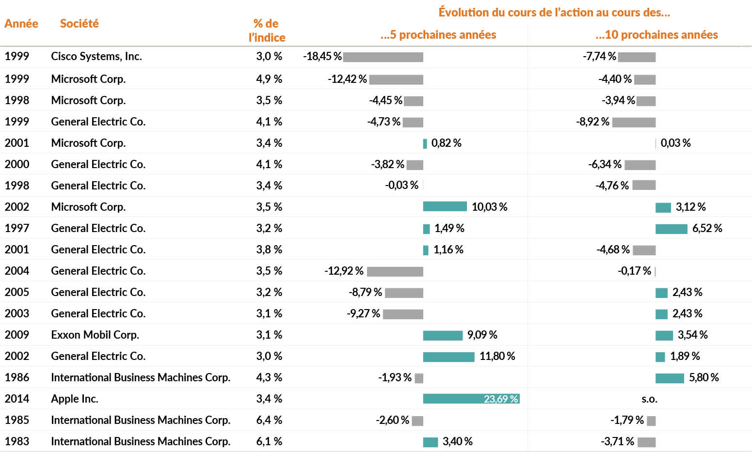 Le tableau ci-dessous présente les actions qui ont atteint un niveau d’ « excellence » tel qu'elles pèsent 3 % dans l'indice S&P 500. Lorsqu'elles ont atteint ce seuil, elles ont toutes été admirées pour leurs succès passés et probablement futurs. Peu d'entreprises semblaient avoir un avenir plus certain que celui-ci, mais il suffit de regarder les faibles rendements sur cinq et dix ans de ces grandes sociétés pendant la période où elles représentaient ces grandes pondérations dans l'indice.