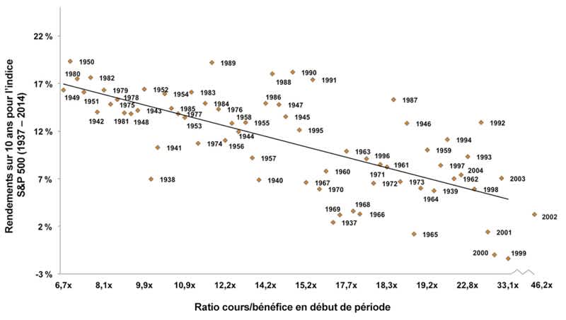 Le tableau ci-dessous* illustre le rendement mobile moyen sur une période de dix ans des sociétés figurant dans l'indice S&P 500 par rapport à leur valeur au moment de l'achat. Contrairement aux données à court terme que notre cerveau utilise pour créer des histoires, ces données remontent à 1937. Elles montrent que plus la valeur du marché est élevée au moment de l'achat, plus le rendement sur les dix années suivantes risque d'être faible.