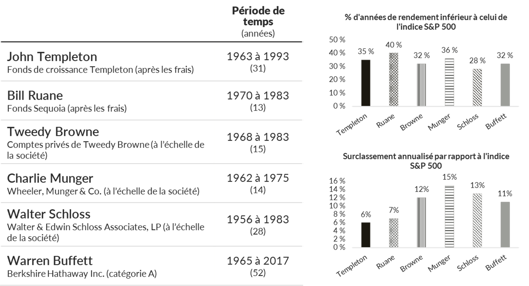 Source : Tweedy Browne Co., « 10 Ways To Beat An Index », 1998; Warren Buffett, « The super investors of Graham-and-Doddsville », Hermes, Fall 1984; and V. Eugene Shahan, « Are short-term underperformance and value investing mutually exclusive? », Hermes, printemps 1986. Rendements totaux en $US. Le rendement de l'investissement de Buffet est basé sur la variation de la valeur de marché par action des actions de classe A de Berkshire Hathaway Inc. L'indice S&P 500 est un indice large, pondéré en fonction de la capitalisation boursière, qui regroupe 500 des plus grandes et des plus importantes actions américaines.
